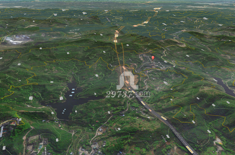 黄线龙脉走势,敬请详查。所谓的玉带湖、猫猫沟水库相去甚远。对燃灯寺公墓影响比较大的为渝蓉高速和青龙回头为案。