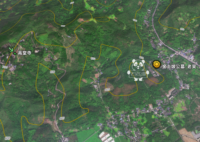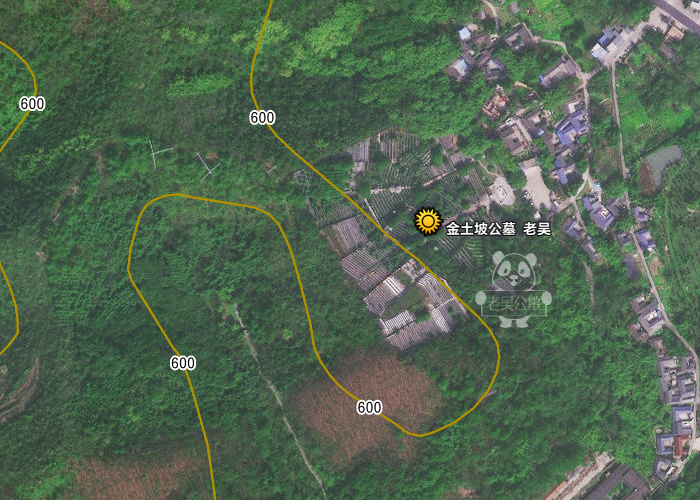 金土坡公墓地处龙门山大邑段,墓区停车场海拔550米。600米海拔基本沿墓区中线。金土坡公墓以东北西南走向的横龙结穴,背后乐山630米,至高为碉龟山海拔约790米。前面案山海拔线碉堡山690米、武隆山670、康家山650米、凤凰山680米。整体案山呈步步高升状。