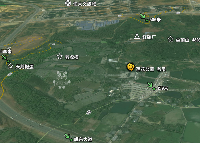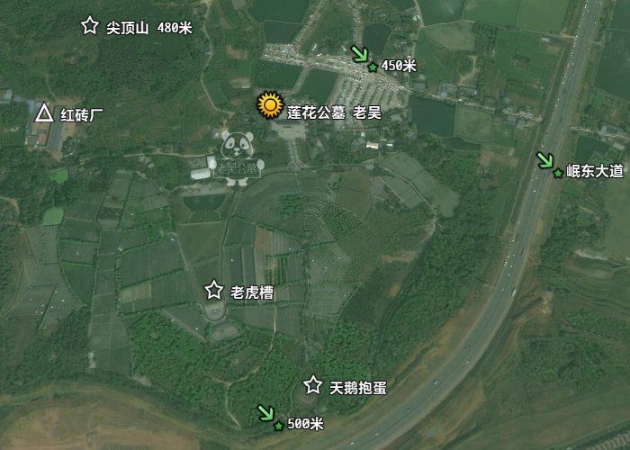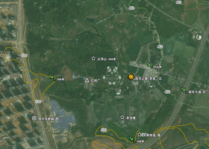 莲花公墓前面的案山或者印山为尖顶山高约480米。