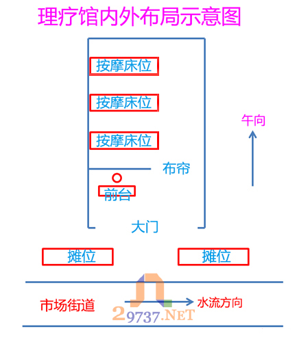 原因分析:市场本为快速消费场所,顾客到市场买东西都是来去匆匆,而且市场大多较脏且臭,谁还有那闲情逸志长时间呆在这样的环境下去做理疗呢?市场外面的人除了买东西外,也不太可能跑到这样的环境来休闲吧!而广场本身就是休闲的地方,有大量的潜在顾客,而且环境较好,适合开理疗店。在此例中市场中的理疗店并无明显的风水缺陷,若将之改造为其它行业,如水果店、肉店、蔬菜店、调味品店、早餐店等,则将又是另一番景象,也由此可见,风水并不能决定一切。